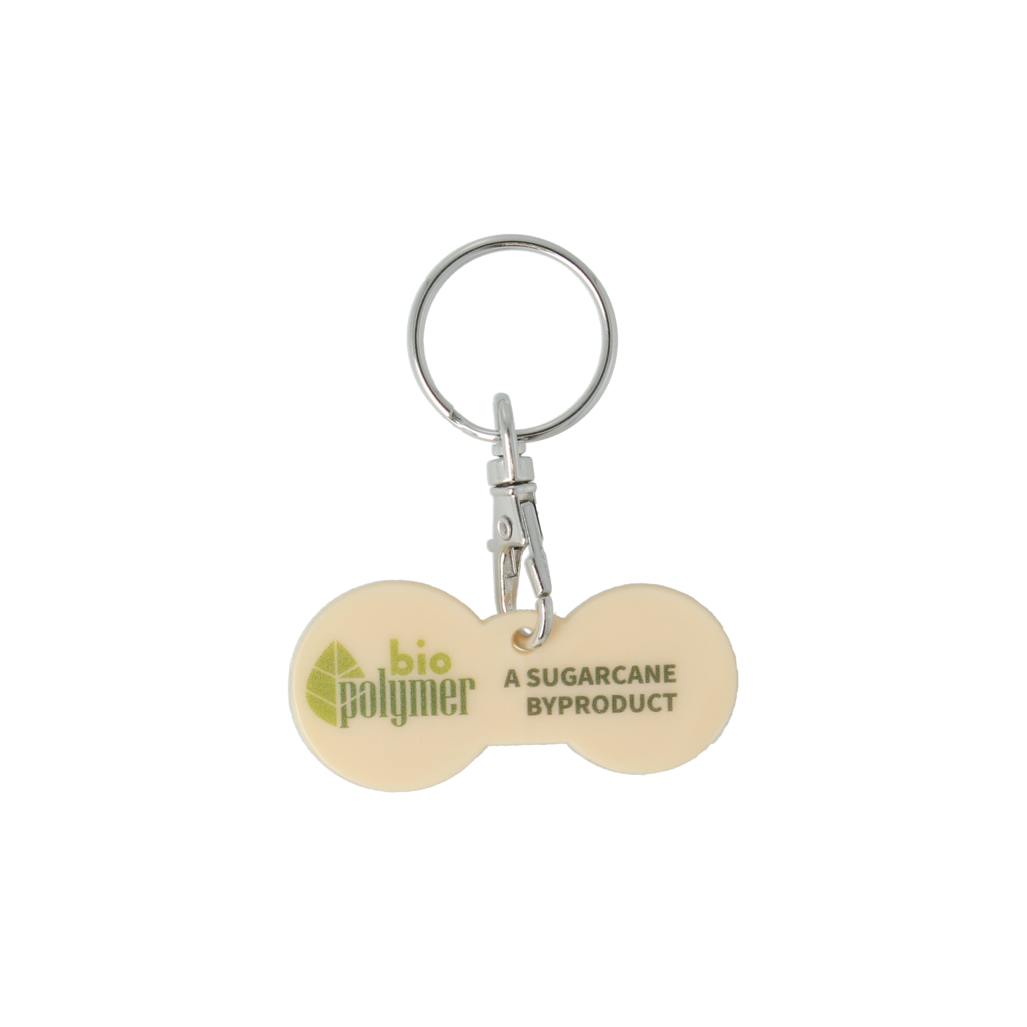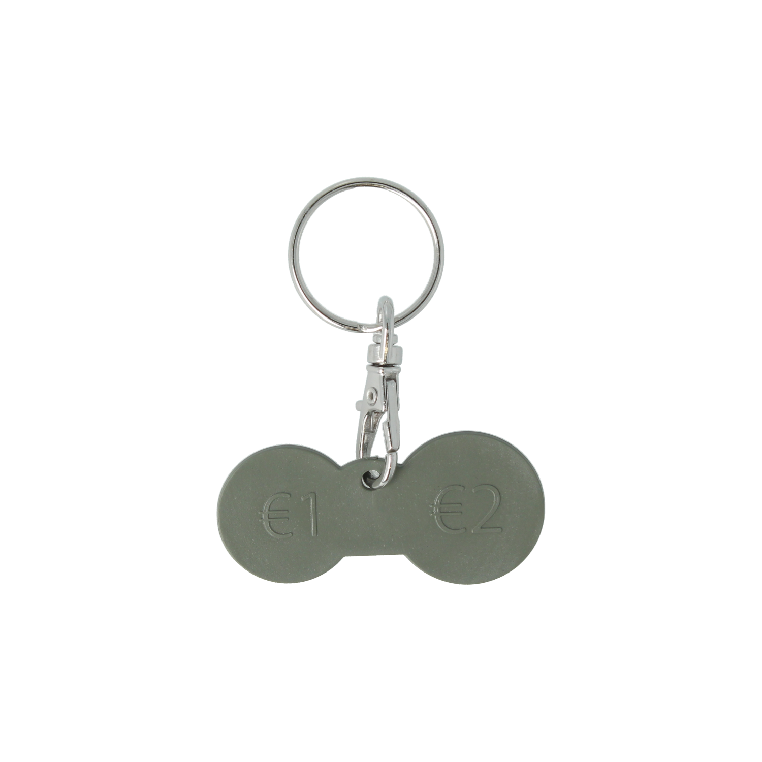 > Keyring offering 1 euro and 2 euro shaped coins, at each end.