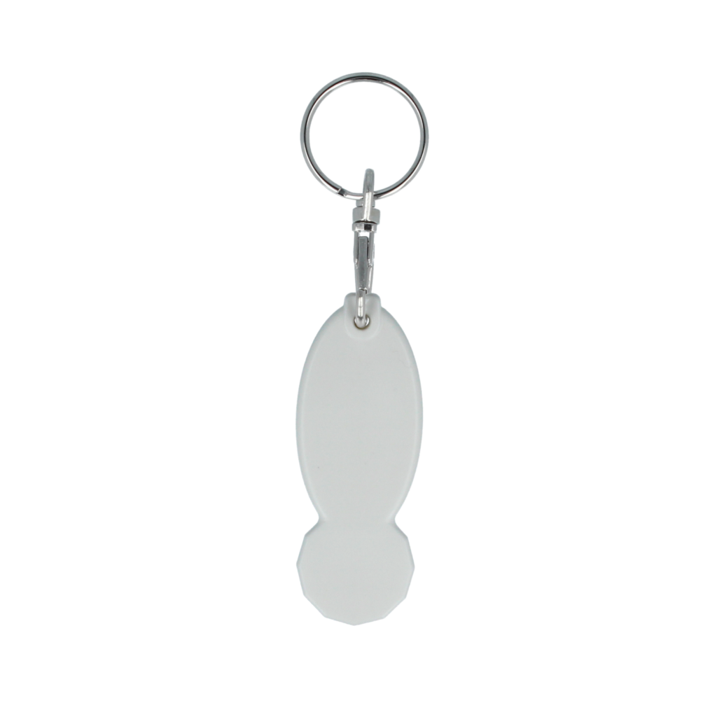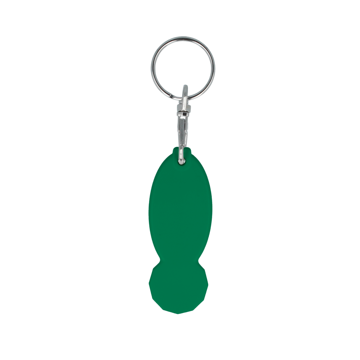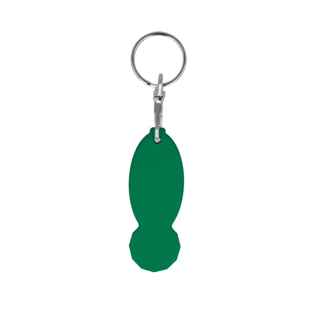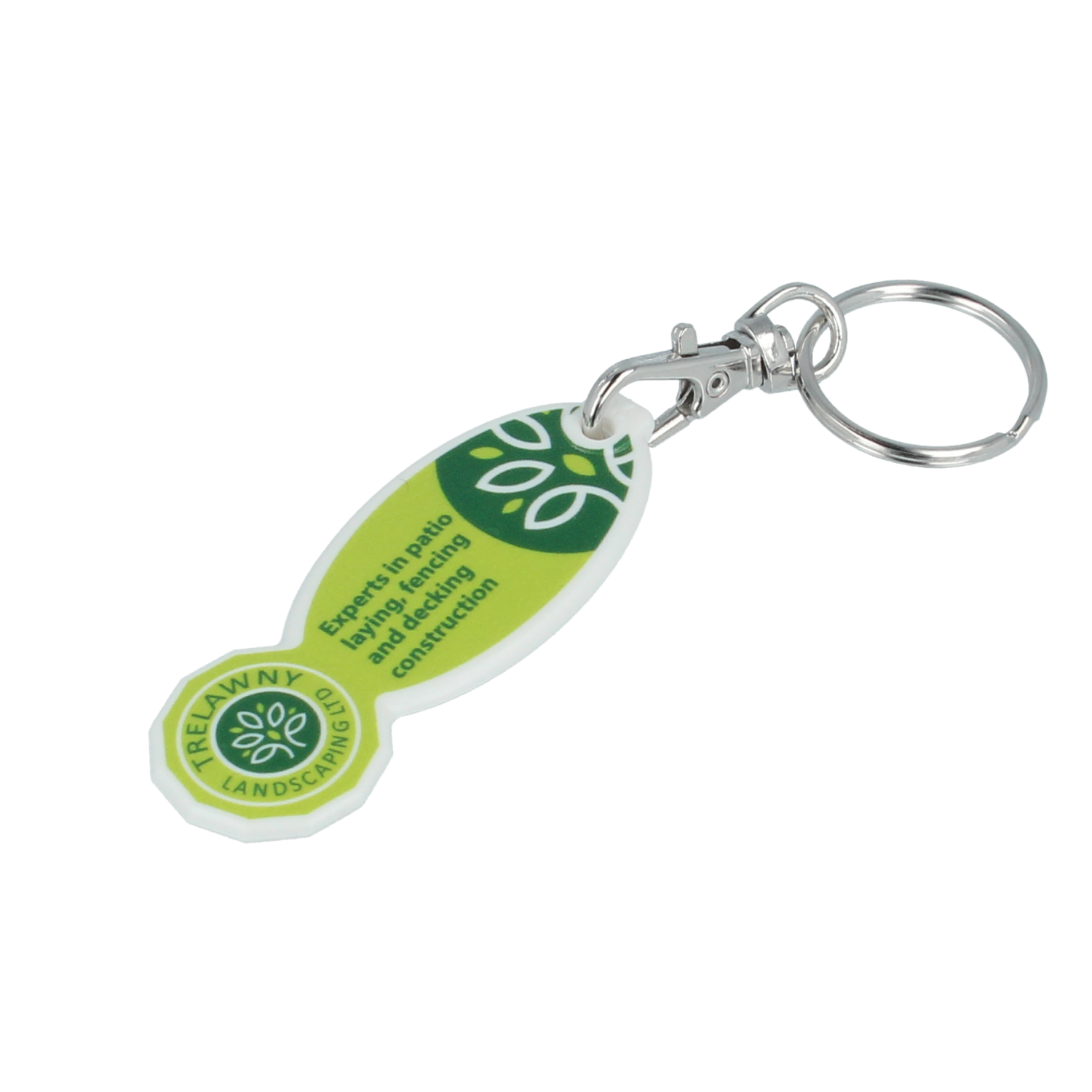 This oval trolley coin is designed with a 3D shape, has 12 sides to replicate a 1 Pound coin at one end and comes with a lobster clip fitting. A larger branding area allows artwork on one or both sides.