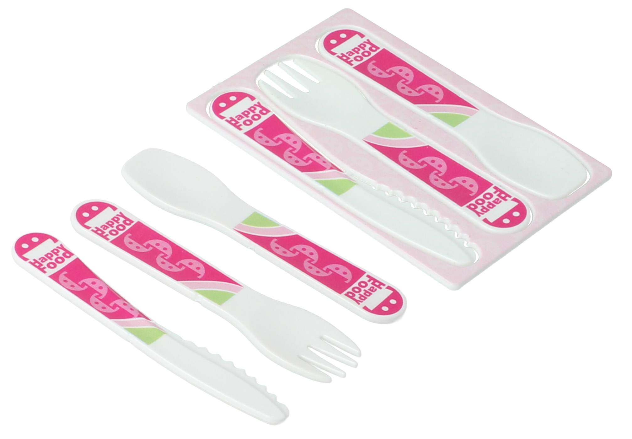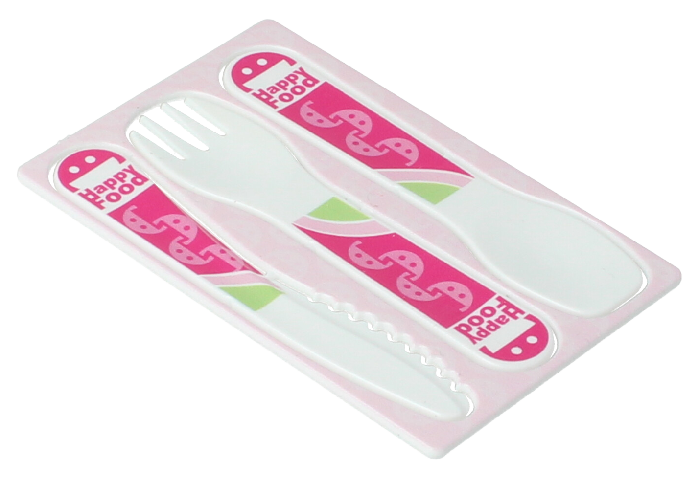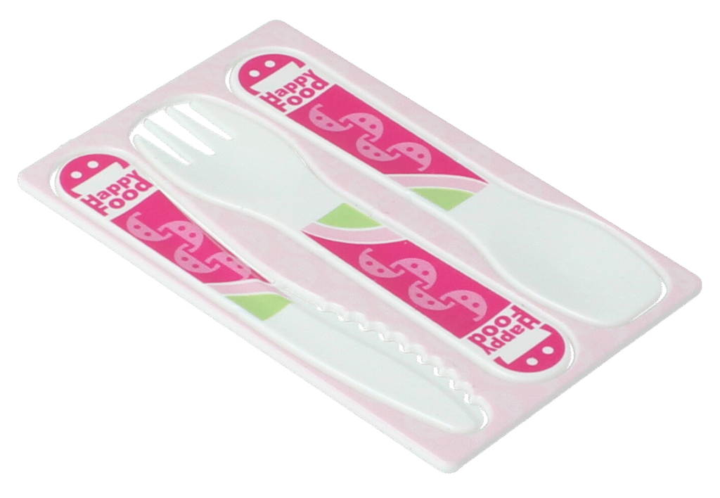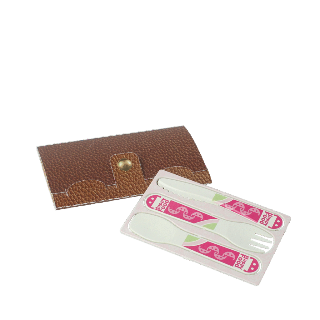 > 2.3mm thick Mini cutlery (knife, fork and spoon) in a credit card style holder.