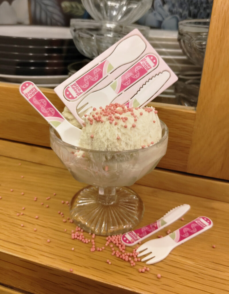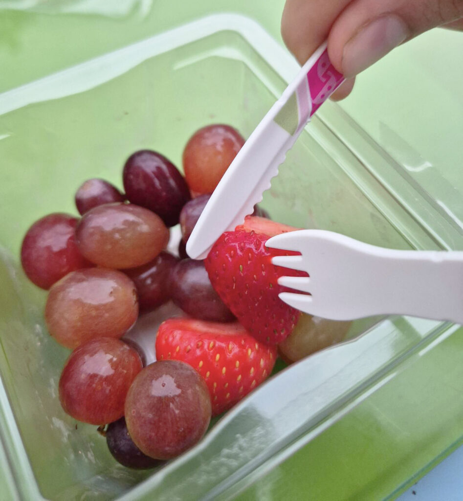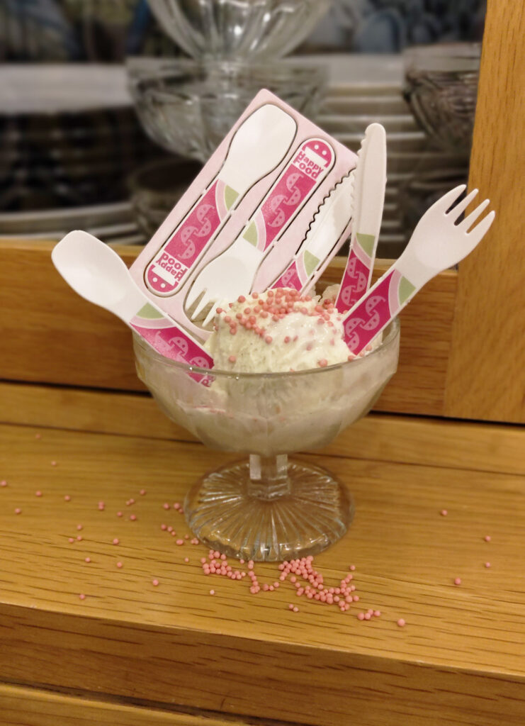 > Credit card pop-out mini cutlery set, UK-made from recycled plastic. Mini knife, fork and spoon