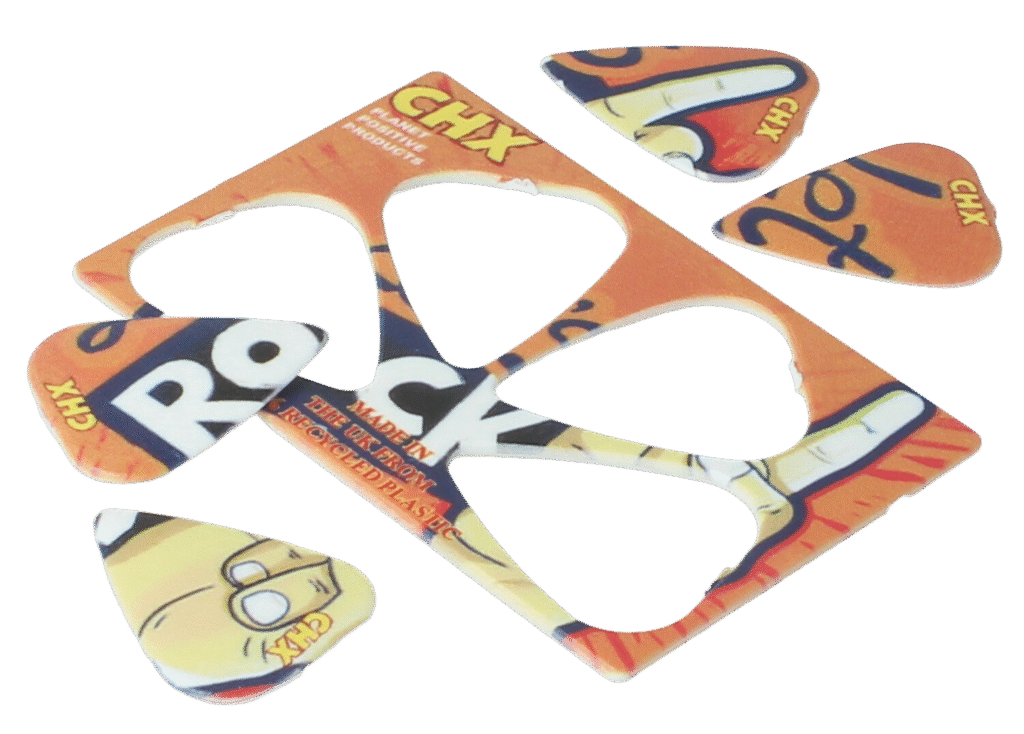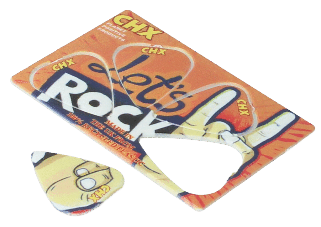 > Credit card pop-out plectrum set, UK-made from recycled plastic. Set of 4 plectrums.